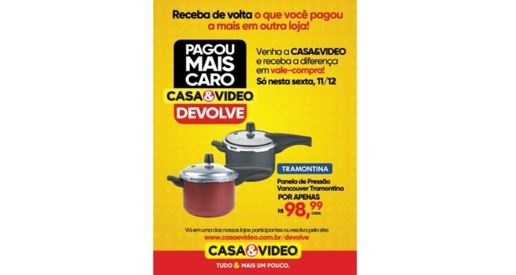 Seguindo essa premissa, agora em dezembro a rede realiza uma ação inédita em sua história: excepcionalmente no dia 11, sexta-feira, o cliente que for a uma das lojas CASA&VIDEO participantes apresentando a nota fiscal de compra de uma panela de pressão Vancouver da Tramontina com valor superior ao praticado na rede – de R$ 98,99 –, receberá a diferença na hora em vale compras. O produto adquirido em outro lugar deverá ter sido comprado nos últimos seis meses e o retorno da quantia excedente será feito por meio de um vale-compras que pode ser usado em qualquer uma das lojas da marca, pelo período de até 1 ano.